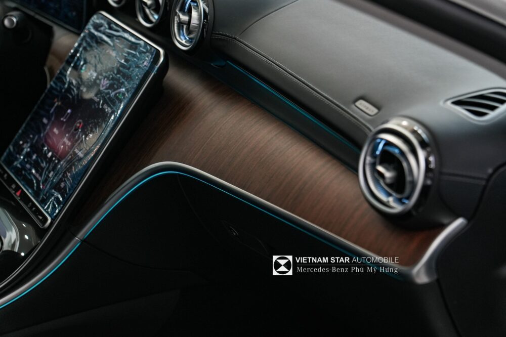 Cabin được bọc da Artico cao cấp (Đen hoặc Nâu Sienna) với đường may tinh tế, kết hợp ốp gỗ open-pore màu nâu trên mặt táp-lô và tựa tay trung tâm – mang lại cảm giác ấm áp, sang trọng nhưng không phô trương. Vô lăng 3 chấu bọc da thiết kế thể thao tích hợp nút điều khiển cảm ứng, cho phép thao tác nhanh mà không rời tay. Ốp bệ bước cửa trước phát sáng dòng chữ “Mercedes-Benz” tạo ấn tượng ngay từ giây đầu tiên mở cửa. Mặt táp-lô & dây đai an toàn bằng da Artico, tựa tay trung tâm phía trước phủ bóng đen, cùng đèn viền nội thất 64 màu tùy chỉnh biến không gian thành phòng khách di động – ấm cúng buổi tối, năng động buổi sáng.