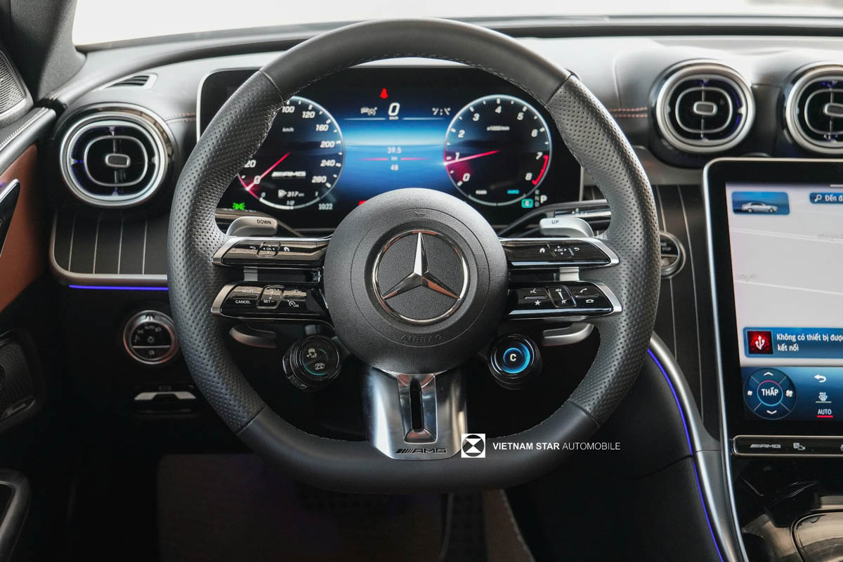 Khoang lái của C43 AMG được thiết kế đậm chất thể thao với vô lăng AMG bọc da, tích hợp nút điều khiển cảm ứng. Màn hình trung tâm 11,9 inch dạng dọc chạy hệ thống MBUX thế hệ mới, hỗ trợ Apple CarPlay/Android Auto và điều khiển giọng nói thông minh.