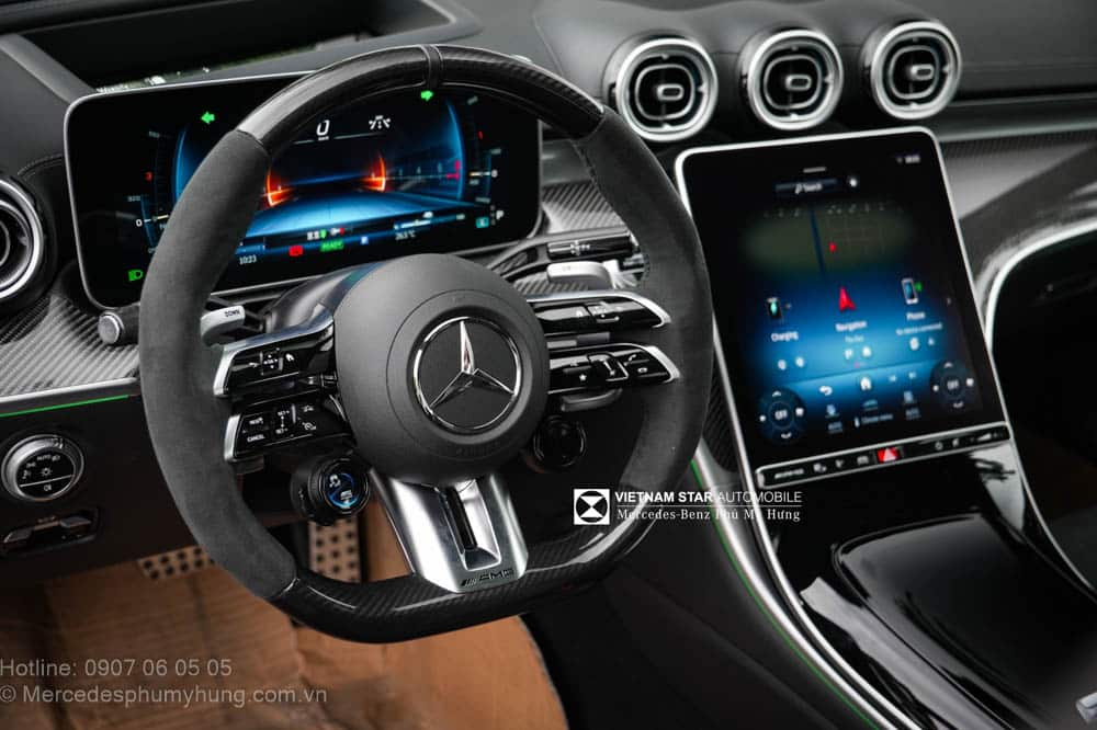 Vô lăng 3 chấu thể thao AMG Performance: Vô lăng của Mercedes-AMG C63 S E PERFORMANCE được thiết kế 3 chấu thể thao, bọc da và trang bị ốp carbon cùng vi sợi MICROCUT cao cấp, cung cấp cảm giác cầm lái chắc chắn và sự phản hồi nhạy bén.