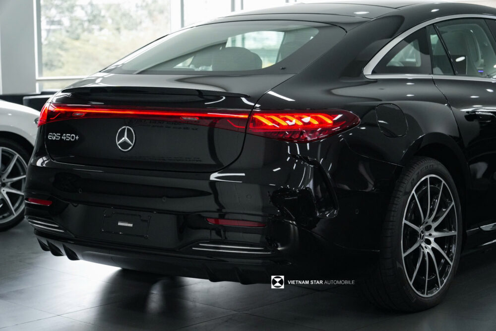 Thân xe Mercedes EQS 450 được định hình bởi đường nét “One Bow” liền mạch, tạo cảm giác như chiếc xe đang lướt đi mà không gặp bất kỳ lực cản nào. Các gân dập nổi nhẹ nhàng dọc thân xe không chỉ tăng tính thẩm mỹ mà còn góp phần vào sự ổn định khí động học, trong khi các tay nắm cửa ẩn và gương chiếu hậu mảnh mai nhấn mạnh phong cách hiện đại. So với BMW i7 – đối thủ trực tiếp – Mercedes EQS 450 nổi bật với sự tinh tế hơn, không quá hầm hố mà vẫn toát lên vẻ uy nghi, phù hợp với những chủ nhân thích sự kín đáo nhưng đầy quyền lực. Đuôi xe, với dải đèn LED nối liền toàn chiều rộng, tạo hiệu ứng ánh sáng sống động khi bật/tắt, kết hợp với cản sau thấp và các chi tiết chrome tinh tế, mang lại sự cân đối hoàn hảo.