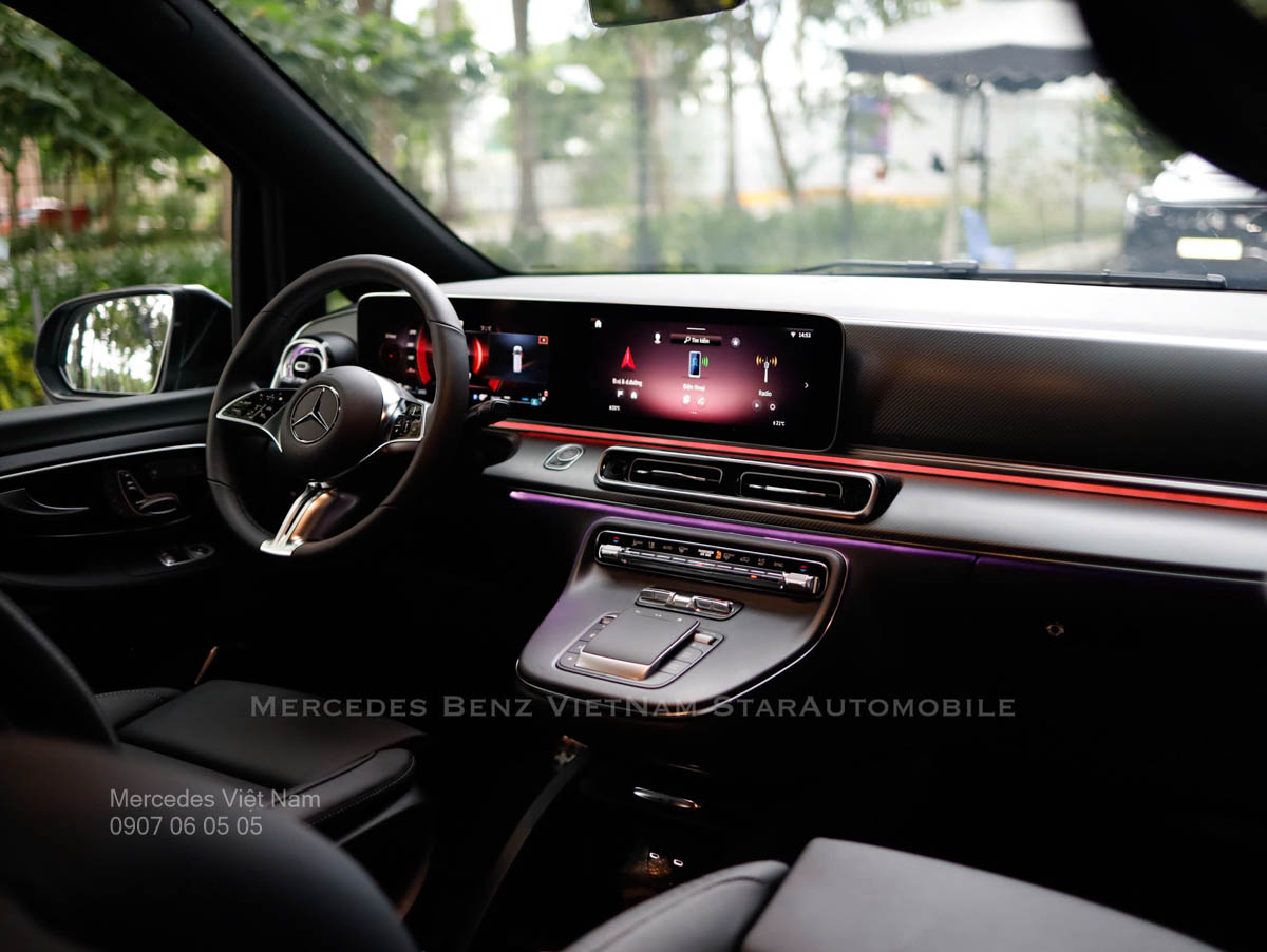 Bước vào khoang nội thất của Mercedes V300 AMG, bạn sẽ bị cuốn hút bởi sự xa hoa như một phòng khách VIP trên bánh xe. Cấu hình 7 chỗ ngồi (2-2-3) được thiết kế dành riêng cho khách hàng thượng lưu, với hàng ghế thứ hai và thứ ba kiểu thương gia, chỉnh điện đa hướng, tích hợp chức năng massage, sưởi ấm và làm mát – một tiện nghi mà các doanh nhân Việt Nam sẽ đánh giá cao sau những ngày làm việc dài. Chất liệu da Nappa cao cấp, kết hợp ốp gỗ walnut bóng loáng và đèn viền Ambient Light 64 màu, tạo nên không gian ấm cúng, thư giãn, như đang ở trong một khách sạn 5 sao di động.
