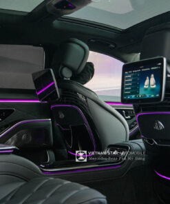 Bắt đầu từ đầu xe, lưới tản nhiệt đặc trưng của Maybach với 27 thanh chrome trang trí, viền chrome xung quanh và ký tự “MAYBACH” nổi bật là trung tâm của mặt trước, mang đến cảm giác quyền uy mà không cần lời nói. Logo Maybach đứng thẳng trên nắp ca-pô, như một biểu tượng của sự kiêu hãnh, thu hút mọi ánh nhìn khi chiếc xe lướt qua những con phố như Nguyễn Huệ hay Trần Hưng Đạo. Đèn pha DIGITAL LIGHT không chỉ chiếu sáng xa đến 650 mét mà còn tích hợp công nghệ chống chói, đảm bảo an toàn mà vẫn giữ được vẻ đẹp thẩm mỹ. Các đường viền chrome quanh đèn pha và lưới tản nhiệt được chế tác thủ công, tạo hiệu ứng ánh sáng lấp lánh dưới nắng miền Nam, khiến Mercedes S450 Maybach trở thành một tác phẩm nghệ thuật di động. Đầu xe không chỉ là phần nhìn đầu tiên, mà còn là lời tuyên ngôn về sự xa hoa tinh tế, nơi mỗi chi tiết đều kể câu chuyện về di sản Maybach – một thương hiệu sinh ra để phục vụ những vị vua và hoàng hậu của thời đại hiện đại.