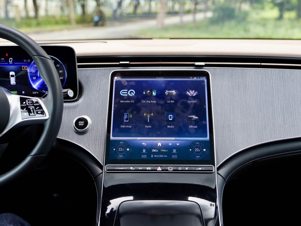 Tâm điểm của nội thất là Hyperscreen tùy chọn – dải màn hình cong 56 inch tích hợp ba màn hình OLED (12,3 inch đồng hồ, 17,7 inch trung tâm, và 12,3 inch hành khách). Hệ thống MBUX thế hệ mới nhận diện giọng nói tiếng Việt mượt mà, cho phép bạn điều khiển từ nhiệt độ điều hòa đến nhạc yêu thích chỉ bằng một câu lệnh. Tôi nhớ một buổi chiều mưa tại showroom Mercedes Phú Mỹ Hưng, khi một khách hàng – anh Hùng, một kỹ sư công nghệ – đã ngạc nhiên khi MBUX phản hồi chính xác yêu cầu “mở nhạc Trịnh Công Sơn”. Với xe cũ, Hyperscreen vẫn hoạt động hoàn hảo nếu được cập nhật OTA, và chúng tôi luôn hỗ trợ cập nhật miễn phí cho khách hàng.