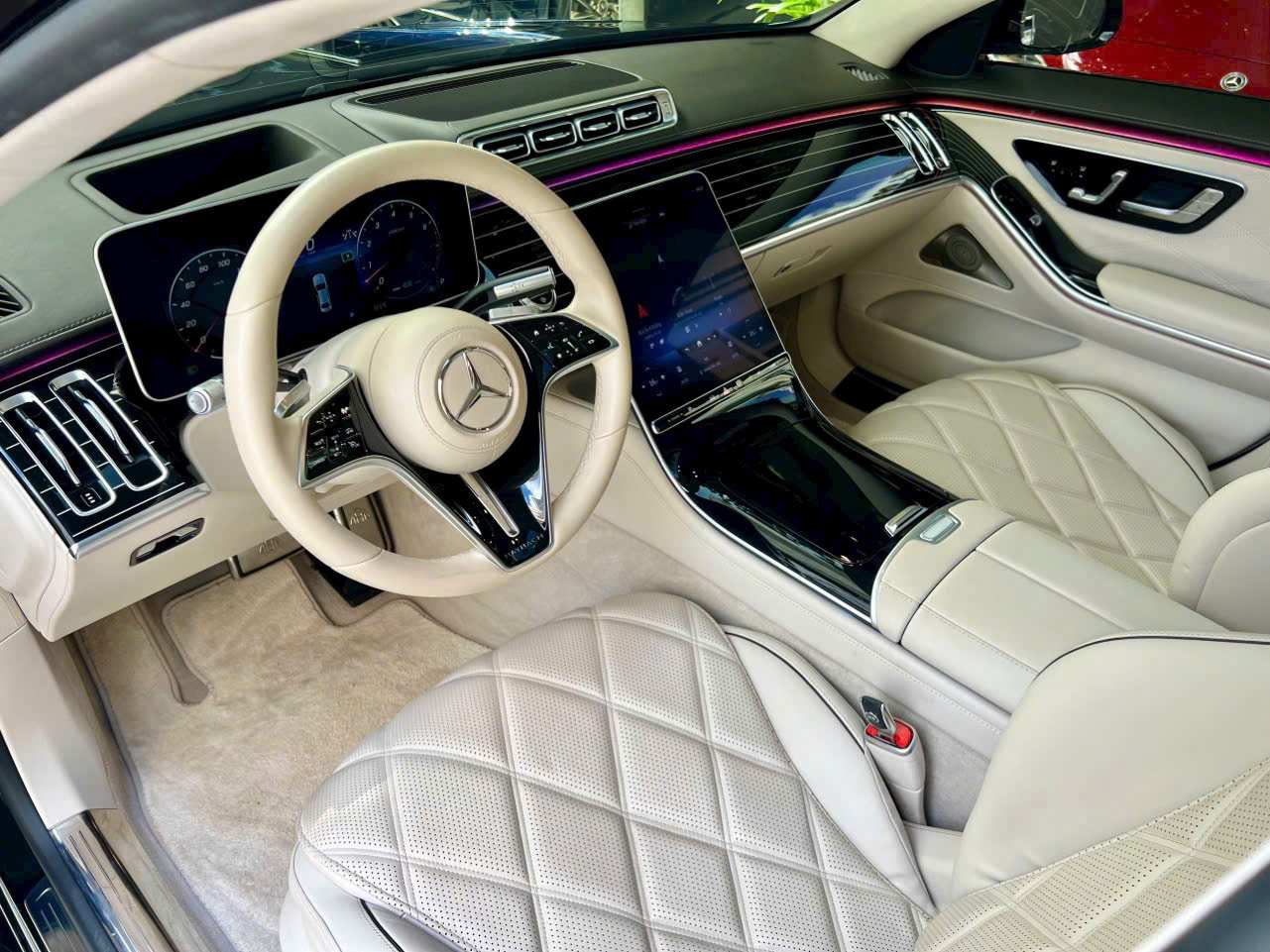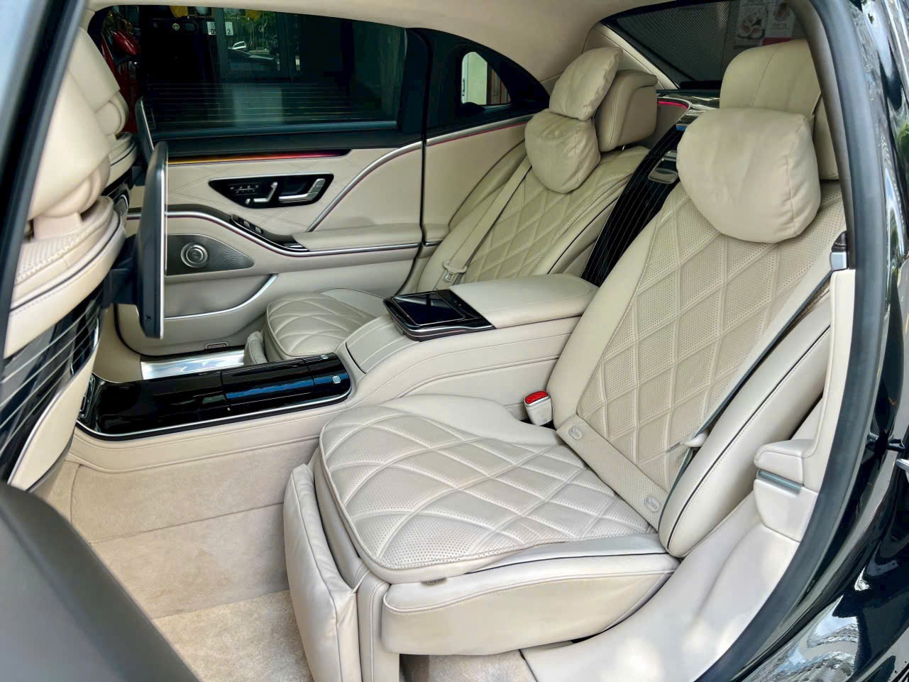 Bước vào cabin của Maybach S450 4MATIC cũ, bạn sẽ cảm nhận ngay sự xa xỉ mà không mẫu xe nào trong tầm giá dưới 7 tỷ đồng có thể sánh bằng. Hàng ghế sau được thiết kế như khoang thương gia, với 2 ghế ngồi chỉnh điện, tích hợp massage, sưởi và làm mát, mang lại trải nghiệm tựa như ngồi trên máy bay hạng nhất.